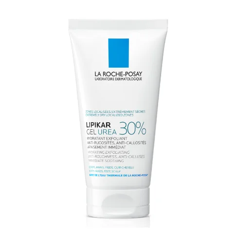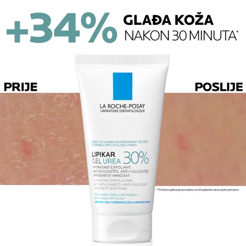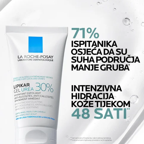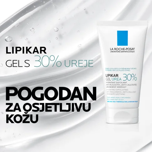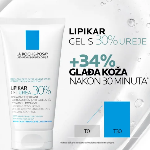 La Roche Posay Lipikar gel s 30% ureje intenzivna je njega iznimno suhih, hrapavih i zadebljalih lokaliziranih područja. Tekstura prozirnog gela.