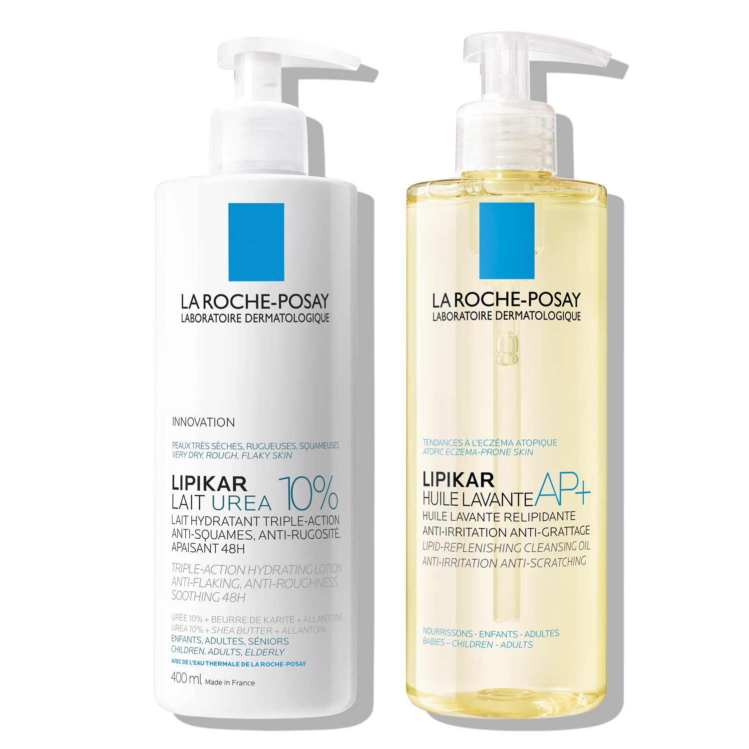 La Roche Posay Lipikar hidratantna rutina za suhu, hrapavu kožu sadrži njegujuće ulje za pranje suhe kože te Lipikar mlijeko za njegu grube i suhe kože s 10% ureje.