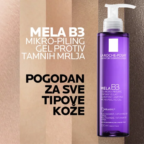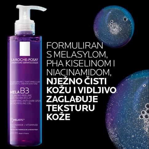 La Roche Posay Mela B3 Mikro-piling gel za čišćenje protiv tamnih mrlja, s patentiranim sastojkom Melasyl™, učinkovito uklanja s lica sve nečistoće i potiče njen ravnomjerni ten.