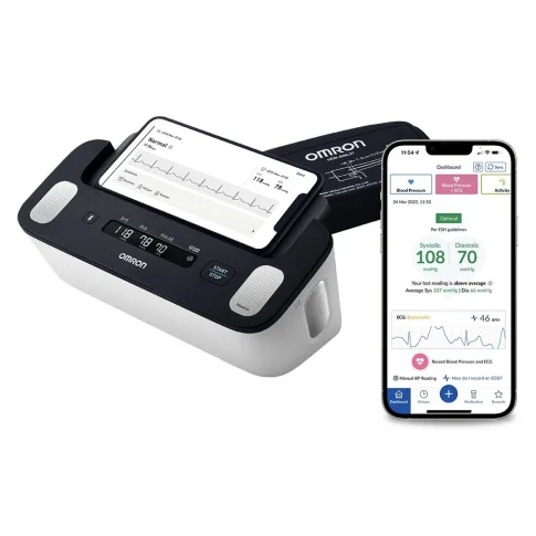 Tlakomjer Omron Complete omogućuje snimanje elektrokardiogram (EKG) zajedno s redovitim mjerenjem krvnog tlaka. 2-u-1 tlakomjer za kućnu uporabu s funkcijom jednokanalnog EKG-a.