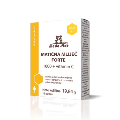 Matična mliječ 1000 + vitamin C je dodatak prehrani kao pomoć kod iscrpljenosti i umora, stresne situacije, fizičkih i umnih napora te drugih stanja iscrpljenosti organizma. Pozitivno djeluje na uklanjanje stresa te pomaže kod iscrpljenosti i umora. Jača i čuva prirodnu otpornost organizma (imunitet) i ima odlično antioksidativno djelovanje. Uravnotežava neurovegetativni sustav i potiče psihofizičku aktivnost. Ima antibiotsko, antivirusno i antiupalno djelovanje.