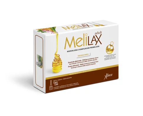MELILAX ADULT- Inovativna linija klinički dokazanih medicinskih proizvoda koji se koriste u slučaju opstipacije (zatvora). Proizvod olakšava pražnjenje crijeva i smanjuje smetnje, iritacije i upale prisutne kod opstipacije (zatvora). Mikroklizma na osnovi meda i Promelaxina, patentiranog molekularnog kompleksa meda iz nektara i mediljke, obogaćenog polisaharidnom frakcijom iz aloe i sljeza.