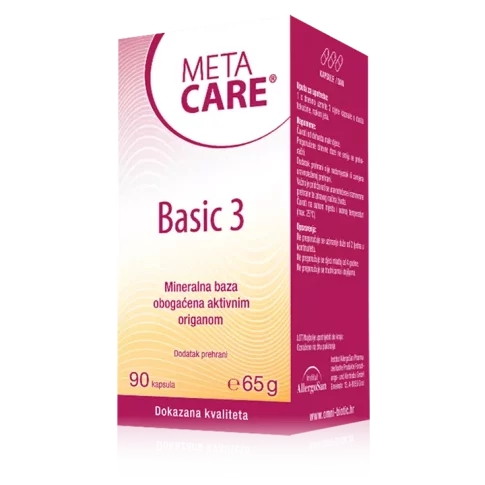 META-CARE Basic 3 kapsule sadrži minerale koji tvore lužnatost kao što su kalij, magnezij i kalcij, u kombinaciji s ekstraktom divljeg origana topivog u vodi. Kalij i magnezij doprinose izmjeni mišićne napetosti i opuštanja, stoga su posebno važni za srčani mišić. Osim toga, kalij ima vrijedan doprinos održavanju normalnog krvnog tlaka, a magnezij doprinosi ravnoteži elektrolita. Uz ostale važne funkcije, kalcij ima utjecaj na funkciju probavnih enzima i doprinosi normalnom metabolizmu stvaranja energije.