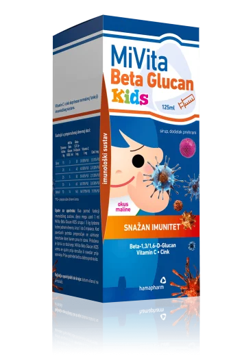 Mivita Beta Glukan Kids sadrži biološki najaktivniji Beta Glucan 10 mg (beta–1,3/1,6-D-glukana) izoliran iz stanične stijenke kvasca Saccharomyces cerevisiae te dodatak vitamina C i cinka.