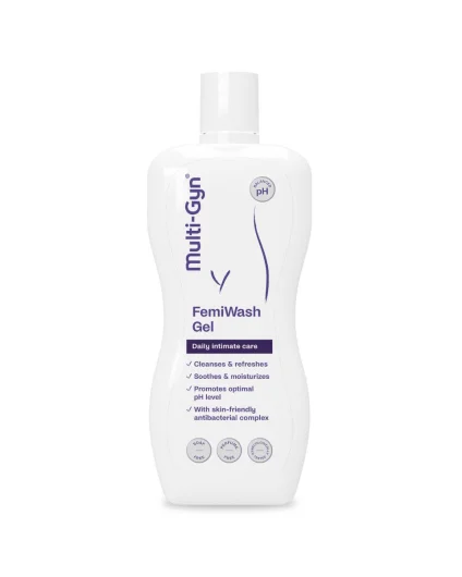 Multi-Gyn FemiWash intimni gel za čišćenje idealan za svakodnevnu upotrebu. Obogaćen prirodnim 2QR-kompleksom i pantenolom, gel umiruje nježnu kožu i sprječava iritacije.
