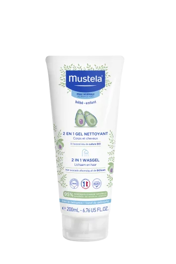 Mustela 2u1 gel za pranje kose i tijela sadrži 92% sastojka prirodnog porijekla. Nježno i učinkovito čisti kožu i vlasište. Visoka tolerancija za kožu i formula bez suza.
