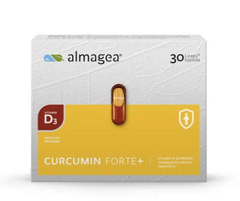 Almagea Curcumin forte+ kapsule sadrže poseban oblik kurkumina koji ima 185 puta veću bioraspoloživost od ostalih nativnih oblika. Proizvod sadrži i vitamin D koji povećava i poboljšava imunološku funkciju.
