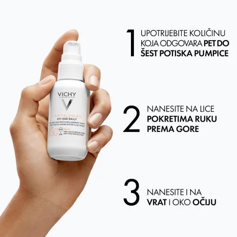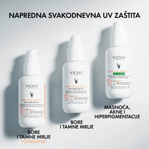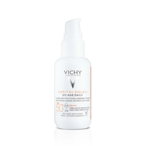 Vichy Capital Soleil UV-AGE fluid protiv fotostarenja sa zaštitnim faktorom SPF50+ visoka je zaštita od sunca za kožu lica s anti-age učinkom. Tonirana varijanta.