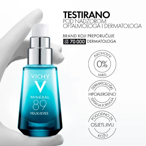 Vichy Minéral 89 Eyes jača barijeru kože na području oko očiju, zaglađuje tanke bore uz 24-satnu hidrataciju i smanjuje tamne podočnjake za odmorniji izgled.