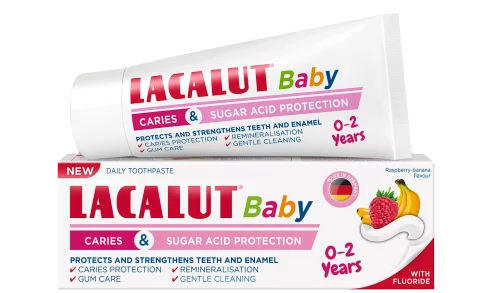 Lacalut Baby pasta za zube štiti od šećernih kiselina koje oštećuju zube, učvršćuje caklinu i potiče remineralizaciju zuba. Za nježno čišćenje, bez dodanog šećera, bez umjetnih boja, s okusom maline-banane.