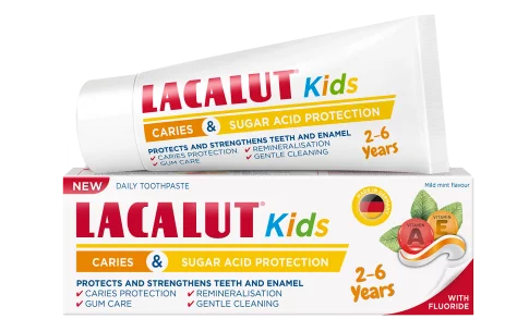 Lacalut Kids pasta za zube štiti mliječne i osjetljive dječje zube od karijesa i šećernih kiselina koje oštećuju zube, učvršćuje caklinu i potiče remineralizaciju zuba. Za nježno čišćenje, bez dodanog šećera. Vitamini A i E njeguju desni. S blagim okusom mente.
