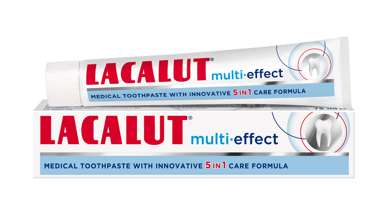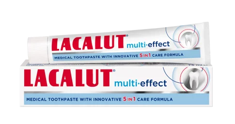 Lacalut Multi-effect je medicinska pasta za njegu zubi i desni s 5 u 1 multi kompleksom: zdrave desni, bijeli zubi, čvršća zubna caklina, zaštita od karijesa, svježi dah.