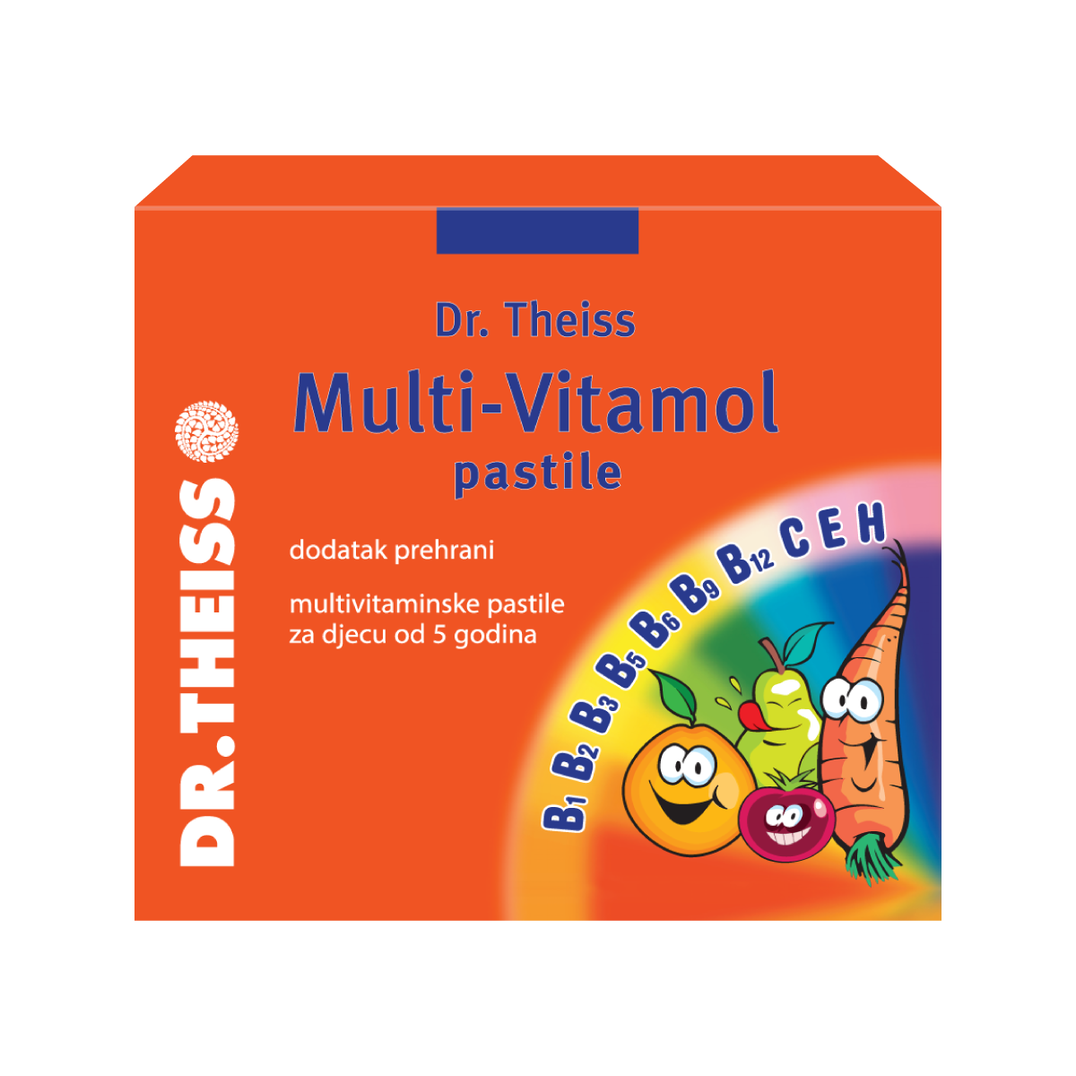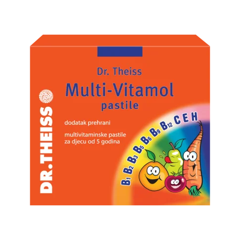 Dr.Theiss Multi-Vitamol pastile za djecu multivitaminske su pastile ugodnog okusa naranče i tropskog voća za djecu iznad 5 godina.