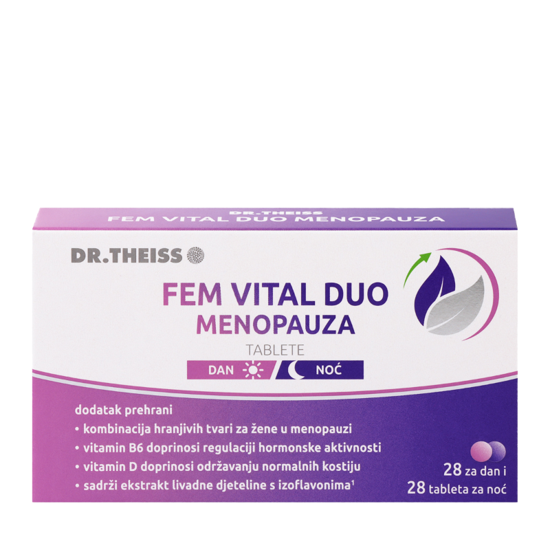 Dr. Theiss Fem Vital Duo Menopauza tablete za dan i noć kombiniraju različite vitamine i minerale: vitamin B6, C, D, E, krom, magnezij i cink. Dodatno su dopunjene ekstraktima hmelja, livadne djeteline i matičnjaka.