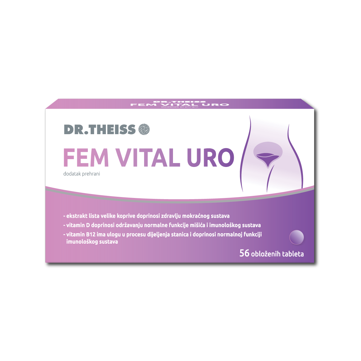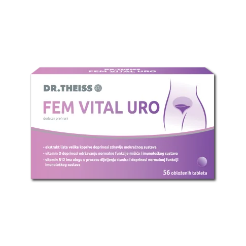 Dr.Theiss Fem Vital Uro tablete za pomoć kod inkontinencije kombiniraju biljne ekstrakte sjemenki bundeve i soje, ekstrakt velike koprive, prah soka brusnice, vitamine D i B12 za zdravlje mokraćnog sustava.