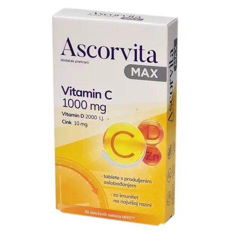 Ascorvita MAX tablete dodatak su prehrani za jačanje imuniteta. Sadrže najveću moguću količinu vitamina C u dodacima prehrani, podržanu vitaminom D i cinkom.