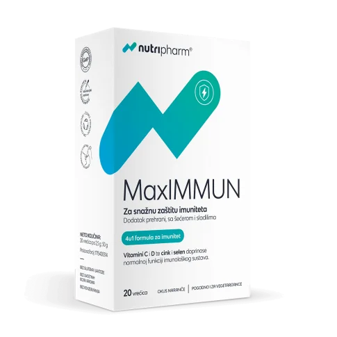 Nutripharm MaxIMMUN vrećice za imunitet ciljana su kombinacija nutrijenata visoke doze ključnih za zdrav i snažan imunitet – vitamina C i D, cinka te selena. Oblik vrećica za direktno otapanje u ustima doprinosi brzoj apsorpciji sastojaka i omogućava praktičnu i ugodnu primjenu. Okus naranče.