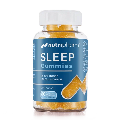 Nutripharm Sleep Gummies jedinstvena je formula za spavanje u obliku ukusnih gumenih bombona okusa naranče čije brzo otapanje u ustima doprinosi apsorpciji sastojaka. Sadrži melatonin, vitamin B6 i biljne ekstrakte matičnjaka i hmelja za opuštanje i brzo usnivanje, a kao sredstvo za želiranje korišten je pektin biljnog porijekla.