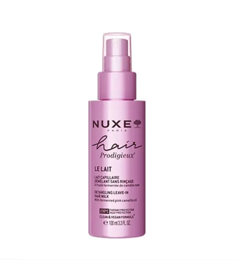 Nuxe HAIR Prodigieux zaštitni i njegujući sprej za kosu trenutno raščešljava kosu te je obogaćuje vlagom i mekoćom, ostavljajući je podatnom i laganom. Ovaj mliječni tretman bez silikona pruža zaštitu od toplinskih uređaja do 230°C/446°F.