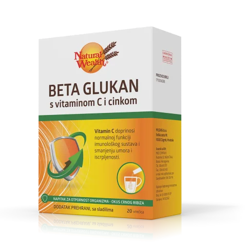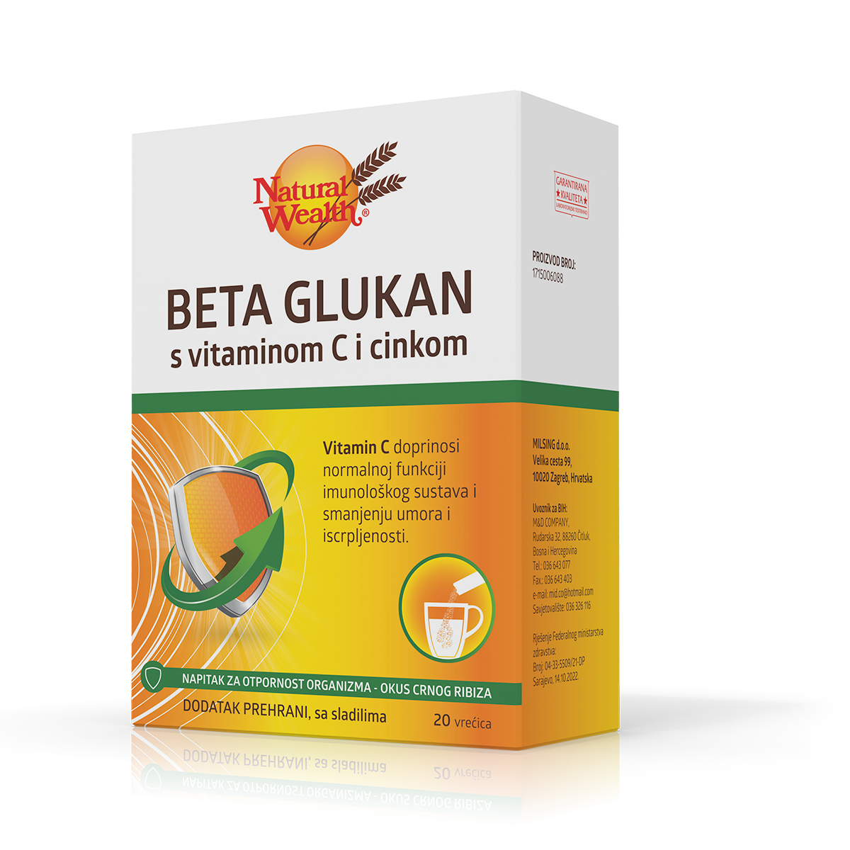 Natural Wealth Beta glukan s vitaminom C i cinkom je izvrstan i praktičan napitak za zaštitu imuniteta koji se može pripremiti kao okrepljujući vrući ili osvježavajući hladni napitak, s dodanim medom i okusom crnog ribizla. Pridonosi smanjenju umora i iscrpljenosti te jača prirodni imunitet organizma.