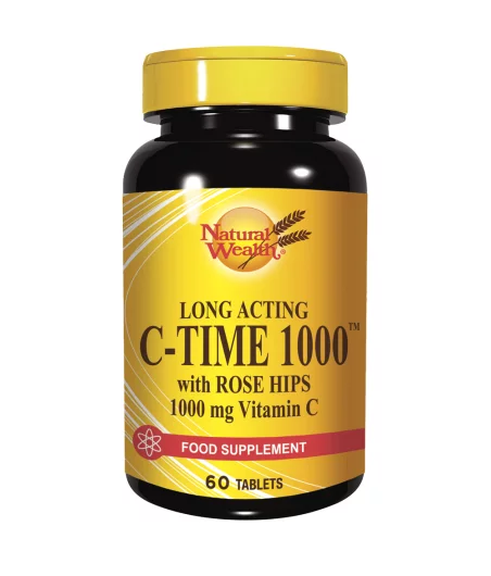 Zahvaljujući formulaciji s produljenim djelovanjem, Natural Wealth Vitamin C-TIME 1000 omogućuje postupno oslobađanje vitamina C u tijelu čime se postiže bolja apsorpcija i snažna zaštita tijekom cijelog dana. Sadrži visoku dozu vitamina C od 1000 mg, uz dodatak šipka.