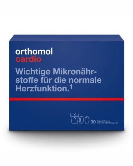 Orthomol Cardio je dodatak prehrani s esencijalnim mikronutrijentima za normalan rad srca. S omega-3 masnim kiselinama EPA i DHA te vitaminom B1 (tiamin) koji doprinosi normalnoj funkciji srca. S polifenolom kakaa.