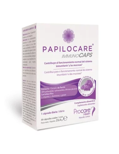Papilocare Immunocaps su dodatak prehrani s vitaminima, mineralima i živim kulturama mikroorganizama. Jedinstvena kombinacija koja poboljšava mikrobiotu rodnice, jača imunitet i pospješuje klirens HPV-a1.