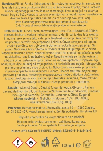 Piktan Family Losion s eteričnim uljima lavande i citronele štiti kožu od uboda komaraca, krpelja, muha i ostalih insekata. Osigurava dugotrajnu zaštitu od 4 do 6 sati nakon primjene.