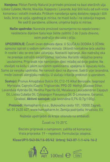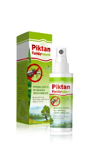 Piktan Family Natural spray je prirodni proizvod za zaštitu od uboda insekata koji sadrži eterična ulja Litsea cubeba, mente, niaulia , čajevca i lavande.