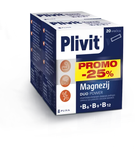 Plivit Magnezij Duo vrećice su dodatak prehrani koji sadrže magnezij 375 mg i vitamine B6, B9 i B12. Doprinose zdravlju mišićnog i živčanog sustava, pomažu kod umora i iscrpljenosti. Okus naranče.