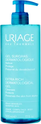 Uriage Extra bogati dermatološki gel za kupanje namijenjen je za svakodnevnu higijenu osjetljive i suhe kože beba, djece i odraslih. Nježno čisti i sprječava isušivanje kože pružajući intenzivnu njegu. Zahvaljujući glicerolu i esterima masnih kiselina čuva i obnavlja hidrolipidni sloj kože pa se preporučuje kod izrazito suhe i osjetljive kože djece i odraslih. Ne sadrži parabene niti sapune. Fiziološki pH. Pogodan je pranje lica, tijela i vlasišta.