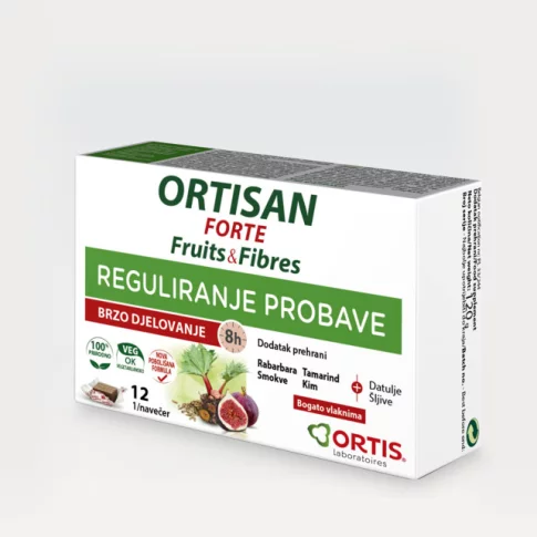 Ortisan forte voćne kocke su dodatak prehrani s biljnim sastojcima koji pomažu pri procesu probave, doprinose normalnoj funkciji crijeva te ublažavaju tegobe nadutosti i tvrde stolice. ortisan forte voćne kocke sadrže plod smokve, koncentrat pulpe tamarinda, suhi ekstrakt korijena kineske rabarbare, pšenični sirup, suhi ekstrakt ploda kima te koncentrat ploda šljive. Ne sadrže konzervans.