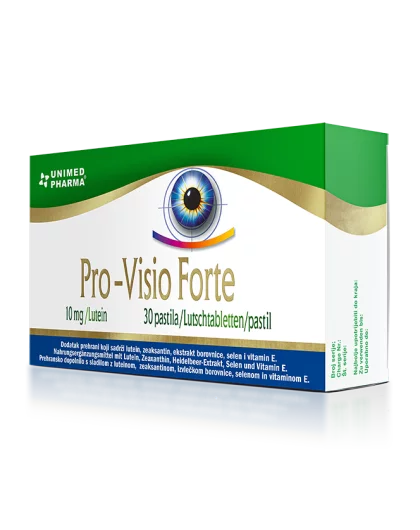Pro-Visio forte je prirodan dodatak prehrani koji pridonosi zdravlju očiju. Jedini je na tržištu u obliku pastila, čije je prednost brža i bolja apsorpcija u organizam. Pro-Visio forte sadrži lutein i zeaksantin - karotenoide koji su u oku prisutni u visokim koncentracijama. Lutein se nalazi u leći i u centru retine u točki gdje je vid najjasniji (makula).