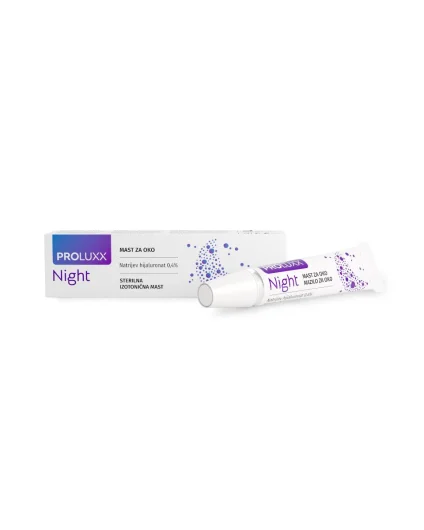 PROLUXX Night mast je sterilna izotonična mast za oči namijenjena ublažavanju simptoma suhog oka i lagoftalmusa. Formulacija masti pogoduje produljenom djelovanju na površini oka, a natrijev hijaluronat stvara zaštitni film na površini rožnice pružajući joj zaštitu i vlaženje.