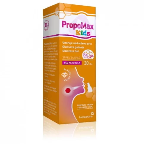PropoMax Kids je bezalkoholni sprej za grlo s propolisom, islandskim lišajem, glicerolom i mentom. Stvaranja zaštitnu barijeru te djeluje umirujuće na nadraženu sluznicu grla i usne šupljine.