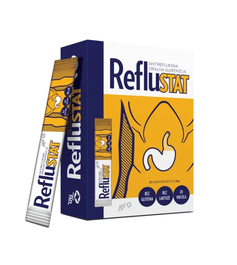 RefluSTAT oralna suspenzija koristi se za smanjenje simptoma žgaravice, povrata kiseline, probavnih smetnji, refluksnog ezofagitisa te nadražaja grla i ždrijela. Pogodan za primjenu kod trudnica.