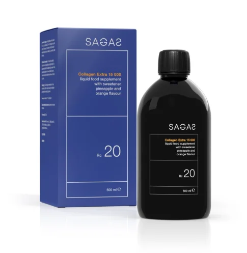 Sagas Rc 20 Collagen Extra 15 000 tekući je dodatak prehrani bogatog okusa ananasa i naranče, koji sadrži visoku koncentraciju 15000 mg Naticol® hidroliziranog ribljeg kolagena vrlo visoke čistoće, hijaluronsku kiselinu, elastin, MSM (metilsulfonilmetan), koenzim Q10, vitamin C, E, A i D te cink i selen koji dugoročno podržavaju ljepotu vaše kože.