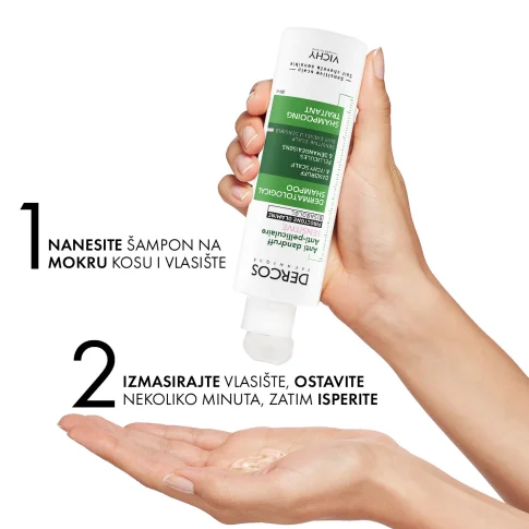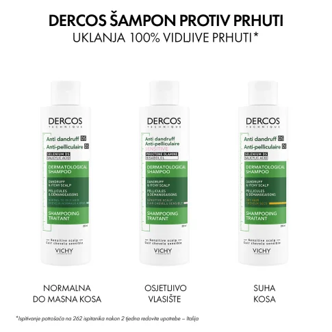 Vichy Dercos šampon protiv prhuti bez sulfata namijenjen je osobama koje imaju osjetljivo vlasište. Šampon ne sadrži sulfate niti druge štetne sastojke. Regulira i pročišćuje vlasište te umiruje iritacije.