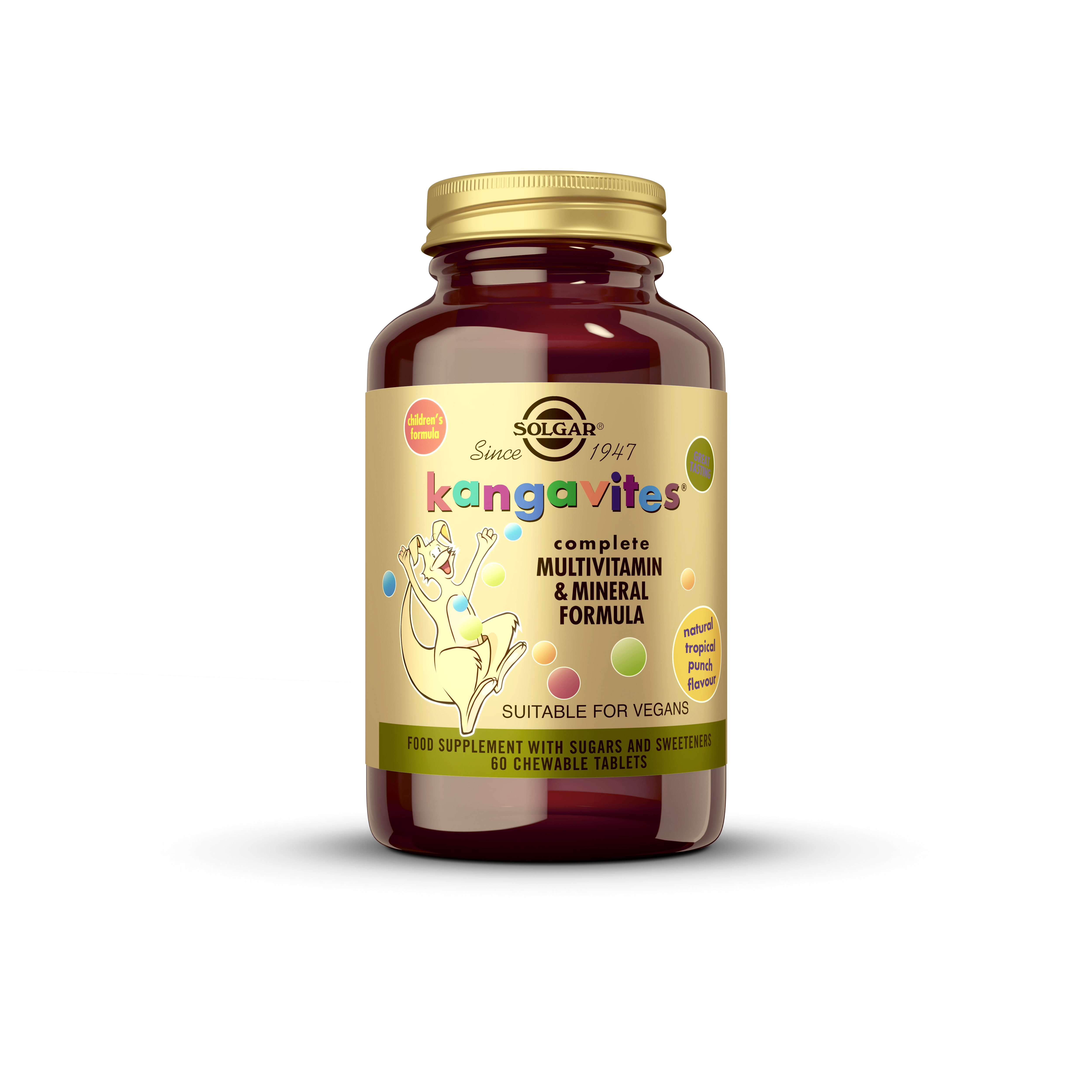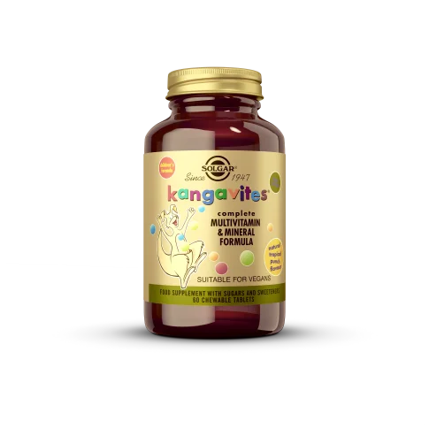 Solgar Kangavites tablete za žvakanje su multivitaminski pripravak s dodatkom voća, povrća, bioflavonoida i lecitina. Namijenjene su za djecu od 6 godina nadalje.