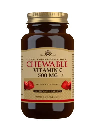 Solgar Vitamin C 500 mg tablete za žvakanje su dodatak prehrani koji sadrži 500 mg vitamina C, ekstrakt poda antilske trešnje 10 mg i prah ploda šipka 4 mg. Doprinose jačanju imunološkog sustava i zdravlju kože i zglobova, zbog poticanja proizvodnje kolagena.