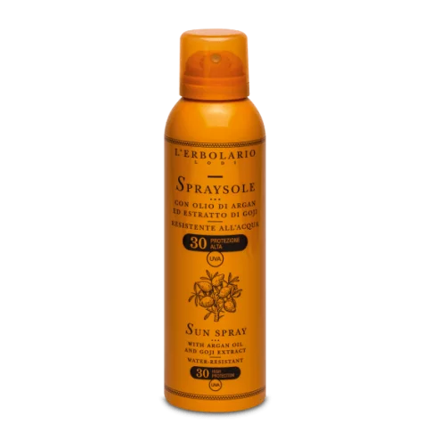 L`Erbolario sprej pruža visoku zaštitu od sunca. Sadrži SPF30+. Obogaćen je uljem argana i ekstraktom Goji bobicama koji njeguju kožu i štite je od slobodnih radikala. Vodootporno.