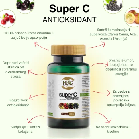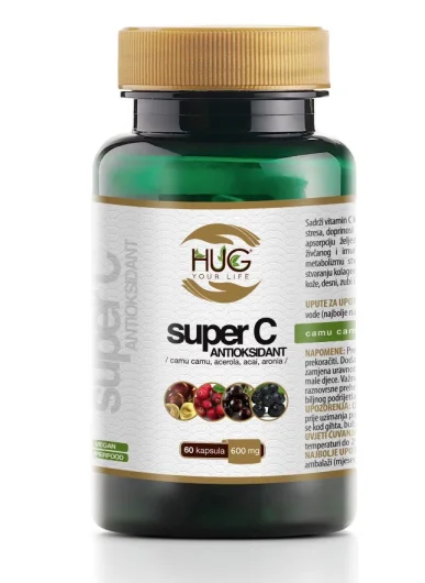 Hug Your Life Super C Antioksidant kapsule bogat su izvor C vitamina. 4 „super voća“ u jednom proizvodu – standardizirani ekstrakti Camu Camu, Acerola, Aronia, Acai.