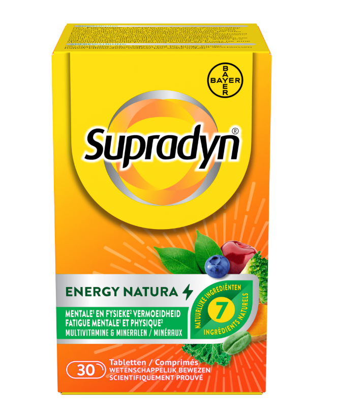 Supradyn® ENERGIJA NATURA svojim sastojcima podupire proizvodnju energije i zaštitu stanica od oksidativnog stresa. Visokokvalitetni biljni kompleks S7™ sadrži ekstrakte zelene kave, zelenog čaja, kurkume, borovnice, brokule, višnje i kelja.