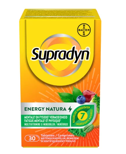 Supradyn Energija Natura sadrže 10 vitamina, 6 minerala i 7 biljnih sastojaka, koji zajedno doprinose normalnom metabolizmu stvaranja energije i smanjenju umora.