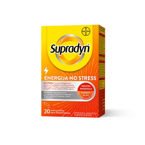 Supradyn ENERGIJA NO STRESS vrećice kombinacija su rodiole, matičnjaka, magnezija i vitamina B kompleksa, koja pomaže vratiti energiju tijekom razdoblja stresa.