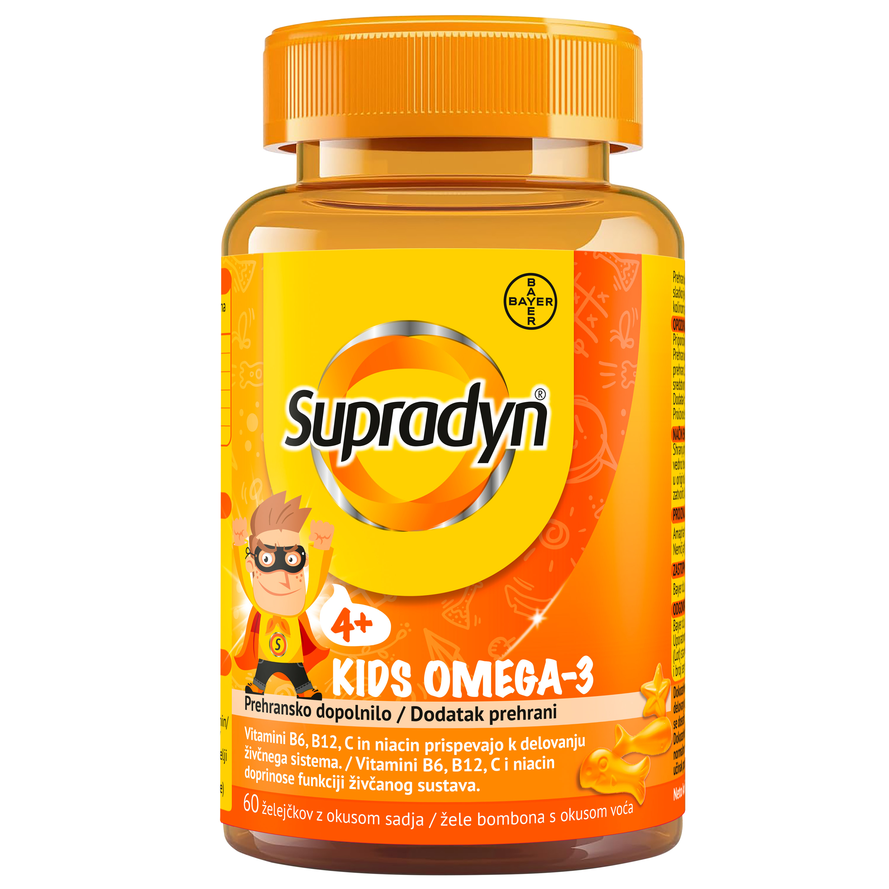 Supradyn Kids Omega-3 ukusni voćni žele bomboni sadrže jedinstvenu kombinaciju DHA, jedne od najvažnijih omega-3 masnih kiselina, kolina i vitamina. Značajno pridonose funkcioniranju živčanog sustava i očuvanju vida. Od 4 godine nadalje.
