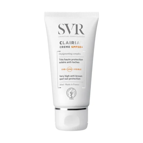 SVR CLAIRIAL krema protiv tamnih mrlja SPF50+ reducira i sprječava isticanje postojećih smeđih mrlja (tamne mrlje nastale tijekom trudnoće, mrlje nastale zbog osjetljivosti na svjetlost). Sprječava pojavu smeđih mrlja zbog izloženosti suncu te posebno nakon dermatoloških tretmana (piling, laser i sl.).
