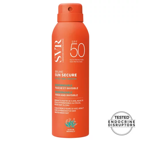 SVR Sun Secure SPF50 nevidljiva maglica za zaštitu od sunca je fina, osvježavajuća maglica koja ne ostavlja tragove na koži. Proizvod otporan na vodu, znoj i trenje. Nježan ljetni miris ne sadrži alergene i nije fotosenzibilan. Mogu ga koristiti djeca nakon navršene 3 godine i odrasli.