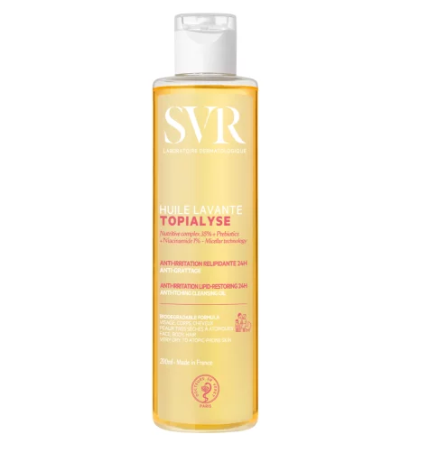 SVR TOPIALYSE ulje za pranje suhe i atopične kože nježan je sindet bez sulfata na bazi ultra nježnih tenzida za pranje najosjetljivije kože i zaštitu od isušivanja. Ovo bogato i hranjivo ulje je pravi tretman koji intenzivno hrani suhu i atopičnu kožu i štiti njen hidrolipidni sloj, smanjujući osjećaj svrbeža.