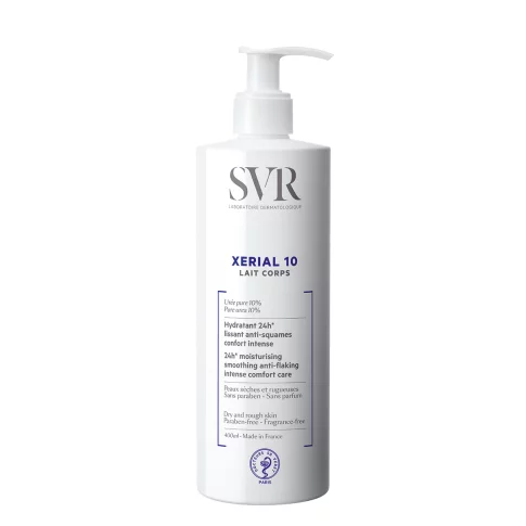 SVR XERIAL 10 mlijeko za suhu i ljuskavu kožu tijela hranjiva je njega za suhu i ljuskavu kožu tijela. Zahvaljujući 10%-tnoj koncentraciji čiste uree, proteaza kompleksu i aminokiselinama, učinkovito uklanja mrtve stanice kože i omogućava hidrataciju tijekom 24 sata.
